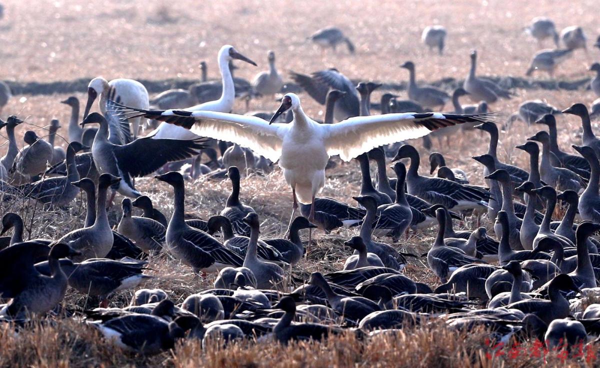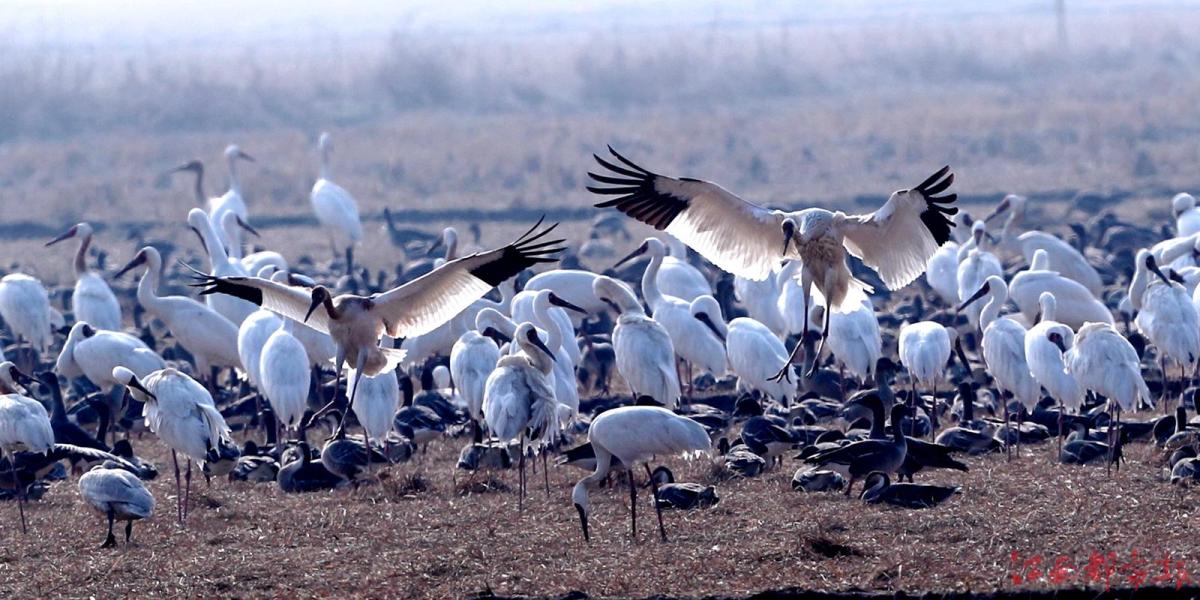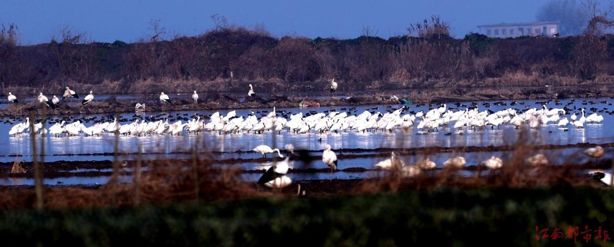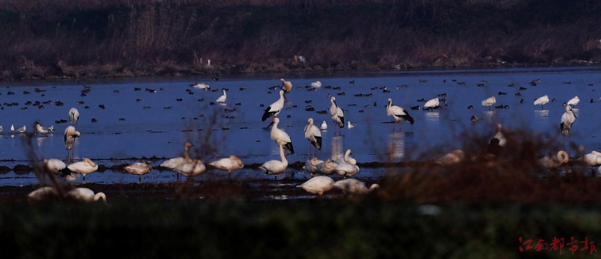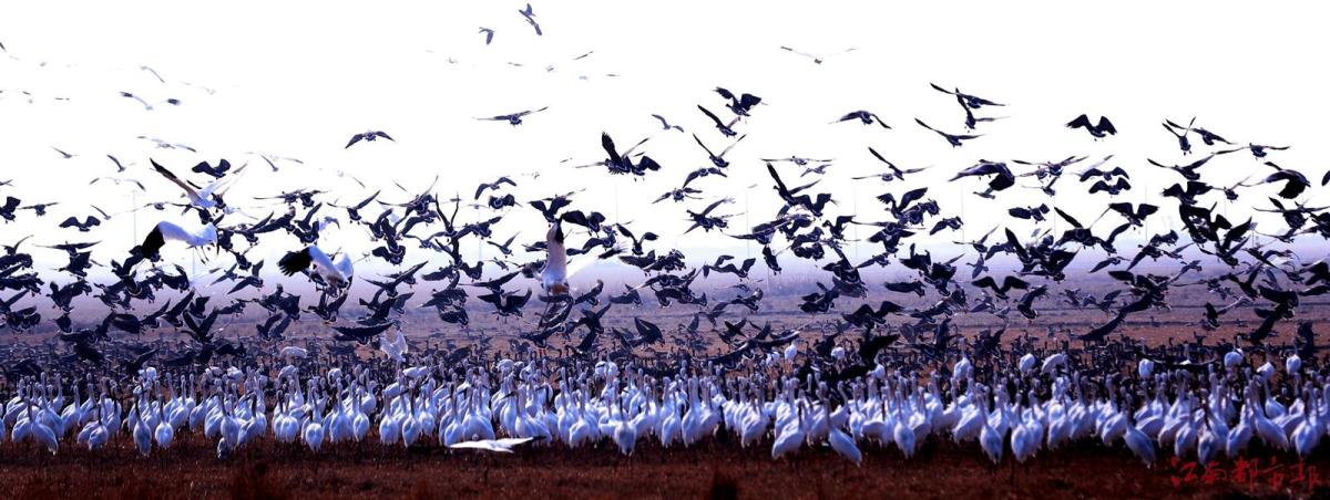 江南都市報訊 全媒體記者許南平攝影報道:1月3日,江南都市報聯合湖南瀟湘晨報,一起走進余干縣康山墾殖場插旗洲分場,以慢直播、微直播等方式,和廣大讀者網友分享數萬只候鳥在“田園鶴谷”覓食棲息的震撼場景。當日,白鶴、白頭鶴、東方白鸛、白枕鶴、灰鶴、小天鵝、白琵鷺、豆雁、鴻雁等候鳥成群結隊鉆入稻田、湖泊。它們時而信步徜徉,時而竊竊私語,時而引頸高歌,時而展翅騰飛,時而在水面嬉逐起舞,時而成群掠湖翱翔,形成了“千鶴鬧鄱湖,萬人齊觀賞”的獨特景觀。在這美麗的天水之間,它們又仿佛是世界上最偉大的交響樂隊,在演奏大自然最美妙的音樂,與鄱陽湖構成一幅人與自然和諧共生的美好圖畫。鄱陽湖位于東亞-澳大利亞候鳥遷徙路線上,是極為重要的候鳥越冬棲息地。近些年,余干縣持續開展生態環境專項整治,候鳥的生存環境不斷改善,當地良好的生態環境吸引越來越多的越冬候鳥來棲息覓食。
