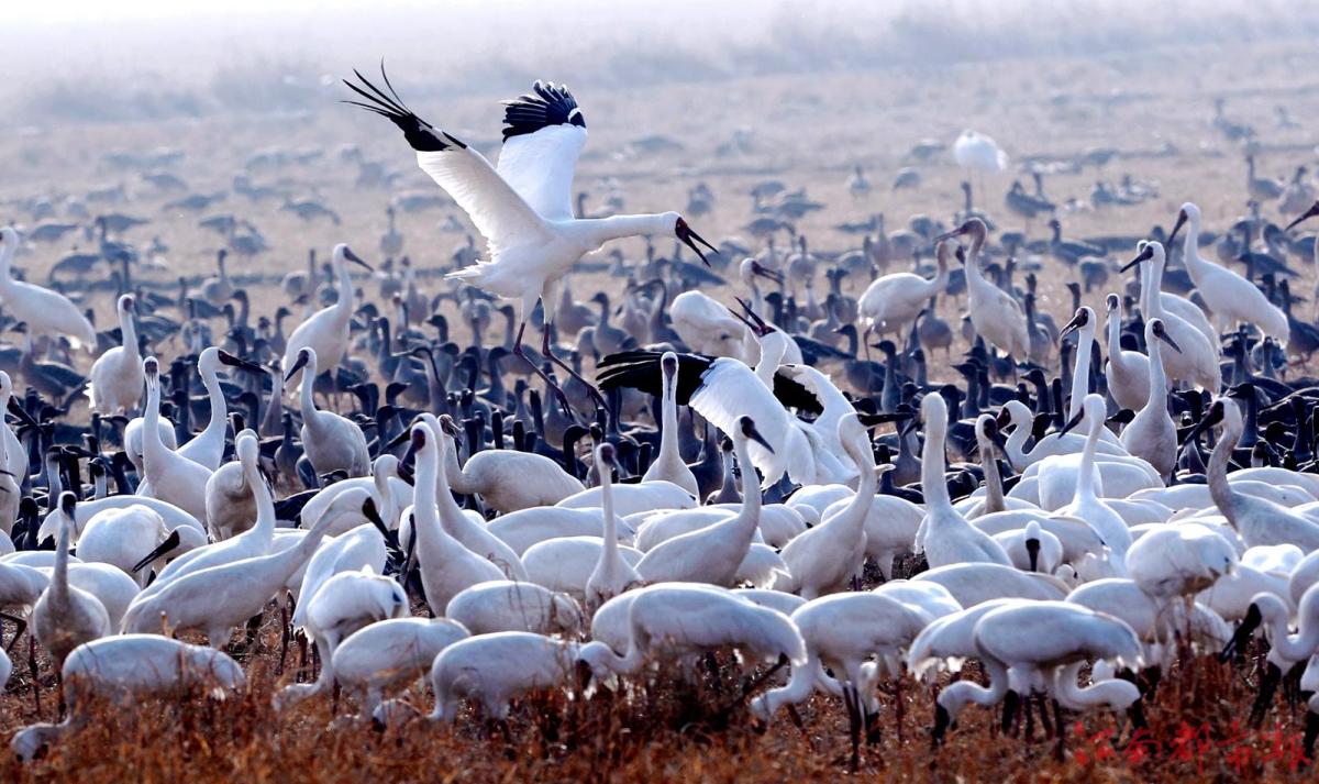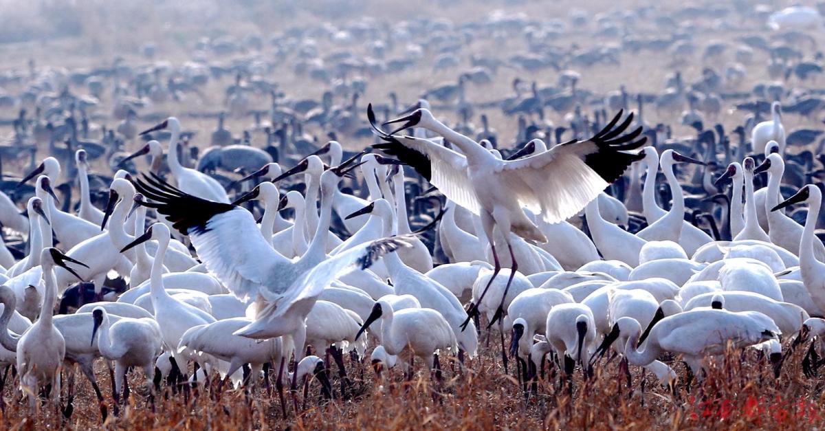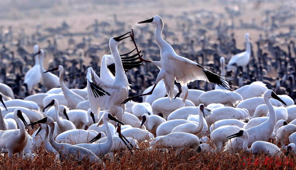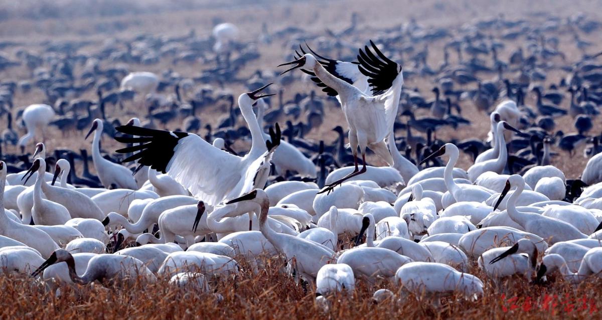 江南都市報訊 全媒體記者許南平攝影報道:1月3日,江南都市報聯合湖南瀟湘晨報,一起走進余干縣康山墾殖場插旗洲分場,以慢直播、微直播等方式,和廣大讀者網友分享數萬只候鳥在“田園鶴谷”覓食棲息的震撼場景。當日,白鶴、白頭鶴、東方白鸛、白枕鶴、灰鶴、小天鵝、白琵鷺、豆雁、鴻雁等候鳥成群結隊鉆入稻田、湖泊。它們時而信步徜徉,時而竊竊私語,時而引頸高歌,時而展翅騰飛,時而在水面嬉逐起舞,時而成群掠湖翱翔,形成了“千鶴鬧鄱湖,萬人齊觀賞”的獨特景觀。在這美麗的天水之間,它們又仿佛是世界上最偉大的交響樂隊,在演奏大自然最美妙的音樂,與鄱陽湖構成一幅人與自然和諧共生的美好圖畫。鄱陽湖位于東亞-澳大利亞候鳥遷徙路線上,是極為重要的候鳥越冬棲息地。近些年,余干縣持續開展生態環境專項整治,候鳥的生存環境不斷改善,當地良好的生態環境吸引越來越多的越冬候鳥來棲息覓食。