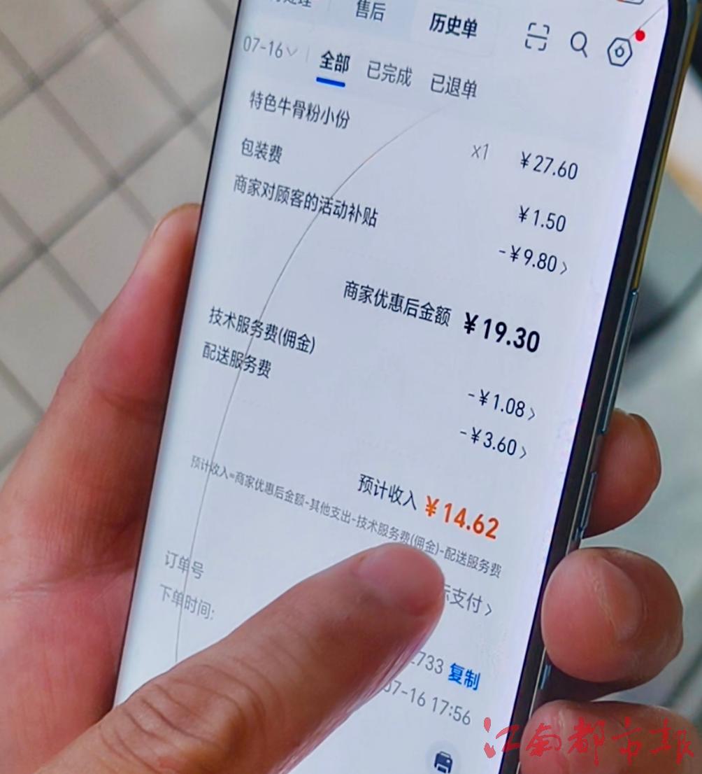 “這完全是薅商家羊毛,平臺拿商家的錢去補貼用戶!”紅谷灘萬達金街一家牛骨粉店的老板給記者算了一筆賬:一份在外賣平臺標價27.6元的牛骨粉,經過各種滿減、打包費和配送費補貼,再扣除平臺傭金后,商家最終到手的收入僅15.14元。“刨除成本后一單只賺一兩元,幾乎沒利潤,配送地點遠一點的話還可能虧本。”